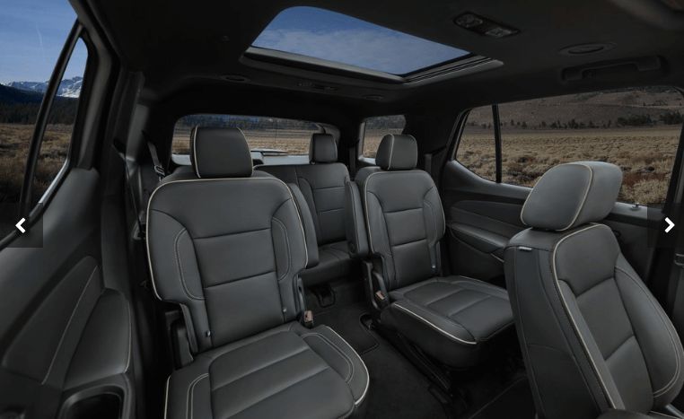 트래버스는 두 번째 열 벤치 시트가 장착되면 8명을 수용할 수 있으며, 두 번째 열 캡틴의 의자가 있는 모델에서 최대 7명을 수용할 수 있습니다. 첫 번째와 두 번째 열은 승객에게 충분한 머리와 다리 공간을 제공하며, 시트는 특히 앞쪽에서 편안하게 패딩 되어 있다. 세 번째 열은 공간이 좁지만, 짧은 여행에서 성인들을 수용할 수 있습니다.