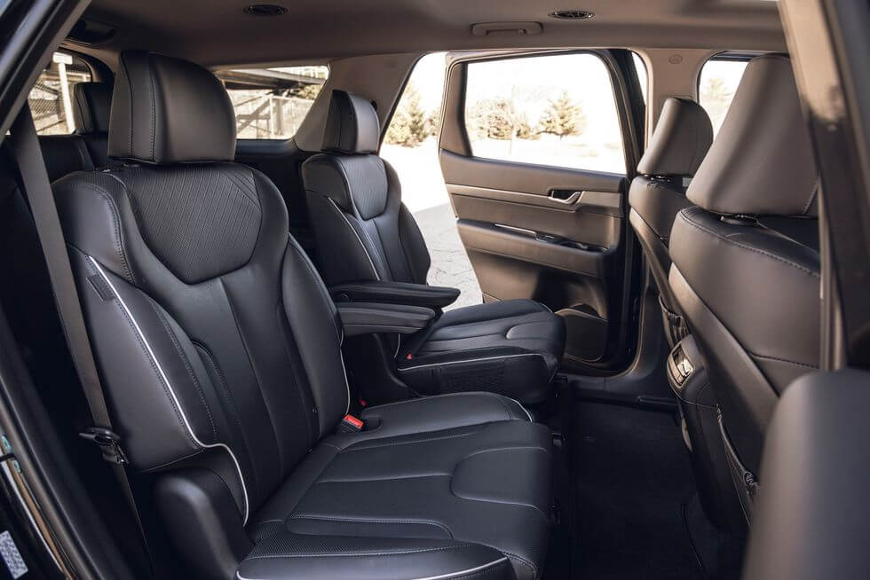 SE와 SEL 트림에는 8명이 탑승할 수 있으며, 리미티드와 캘리그래피에는 2열 캡틴 체어가 있어 탑승 인원이 7명으로 줄어듭니다. 어느 쪽이든 3열 모두 탑승자를 위한 넉넉한 공간을 제공합니다. 2열에는 시트를 앞으로 이동시키는 버튼이 있어 3열에 쉽게 접근할 수 있습니다. 2열 및 3열 파워 폴딩 시트는 SEL에서 선택 사양으로, Limited와 캘리그래피에서는 기본 사양으로 제공됩니다. 노면 소음이 억제되지만, 상당한 양의 풍절음이 도어를 투과합니다. 팰리세이드는 모든 좌석을 접었을 때 적재 공간이 86 큐빅피트이며, 마지막 2 열을 내린 상태에서 총 33개의 기내용 캐리어를 적재할 수 있습니다. 2열을 똑바로 세우고 3열을 접으면 적재 공간은 총 46 큐빅피트입니다. 3열을 사용하면 부피가 18 큐빅피트로 줄어듭니다. 하지만 적재 바닥 아래에는 진흙이나 젖은 물품을 보관할 수 있는 공간이 있습니다. 도어의 수납공간은 좁지만 센터 콘솔 안쪽과 아래에 적당한 수납공간이 있습니다.