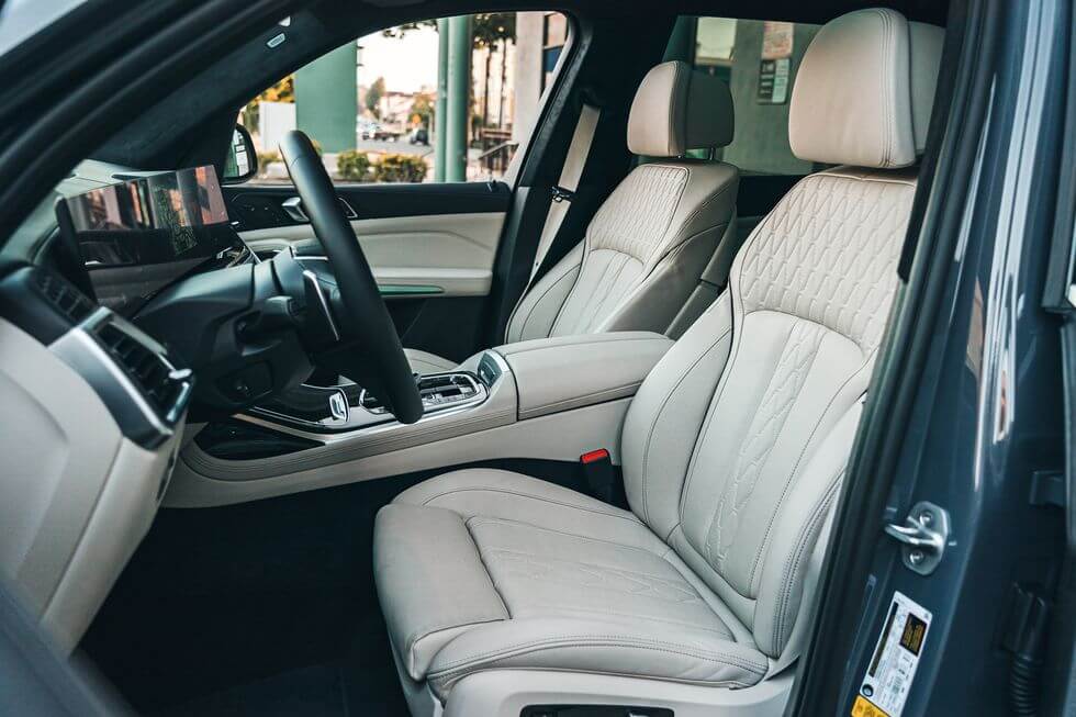 BMW X7의 실내는 우아하게 구부러진 대형 디지털 디스플레이로 대시보드의 중심을 장식하고 있습니다. 이 디스플레이는 운전자를 위한 12.3인치 게이지 클러스터와 14.9인치 터치스크린 인포테인먼트 시스템을 포함하여 운전자에게 시각적으로 풍부한 정보를 제공합니다. 실내는 또한 앞 좌석 열선 시트, 파노라마 선루프, 전동 조절 가능한 스티어링 휠, 앰비언트 인테리어 조명 등 다양한 프리미엄 사양으로 꾸며져 있어, 고급스러움과 편안함을 동시에 제공합니다. 그러나 X7의 2열 캡틴 체어는 전동식으로 작동되며, 3열 승객을 태우고 내리는 과정에서 움직임이 다소 느려서 사용자의 불편을 초래할 수 있습니다. 또한, 장시간 운전 시 뒷좌석의 공간이 성인에게는 다소 협소할 수 있어, 이 점도 주목할 만한 단점으로 지적됩니다. 하지만 X7의 실내 수납 공간에 대해서는 일반적으로 긍정적인 평가를 받습니다. 3열 뒷좌석에는 기내용 캐리어 3개를 겨우 수납할 수 있는 공간이 있지만, 뒷좌석을 접어 수납 공간을 최대화했을 때에는 총 33개의 짐을 실을 수 있는 넉넉한 용량을 자랑합니다. 이러한 수납 능력은 X7을 가족 여행이나 대규모 짐을 운반해야 하는 상황에 아주 적합한 차량으로 만들어줍니다.