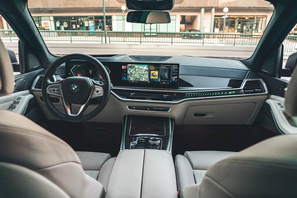 BMW X7의 iDrive 인포테인먼트 시스템은 대시보드 상단에 위치한 곡면 유리 패널 아래 14.9인치 터치스크린을 통해 조작됩니다. 이 시스템은 또한 센터 콘솔에 위치한 대형 회전식 노브와 제스처 컨트롤 기능을 통해서도 제어가 가능하며, 사용자의 편의성을 크게 향상합니다. 모든 X7 모델에는 Wi-Fi 핫스폿 기능(별도 구독 필요)과 BMW 디지털 키가 제공되어, 스마트폰 앱을 통한 차량 기능의 원격 제어가 가능합니다. 추가적으로, 하만/카돈 스테레오 시스템 강화와 무선 충전 기능은 선택 사양으로 제공됩니다.