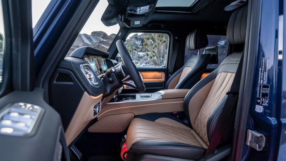 G-클래스의 준군사적 외관과는 대조적으로, 그 내부는 럭셔리한 사양으로 가득 찬 고급스러운 공간을 자랑합니다. 이 차량은 12.3인치 디지털 계기판, 전후방 열선 시트 및 가죽 커버링, 전동 조절 가능한 스티어링 칼럼, 삼영역 자동 기후 조절 시스템, 선루프, 그리고 세 개의 12V 전원 소켓을 기본적으로 탑재하고 있습니다. 선택적으로 추가할 수 있는 옵션에는 앞 좌석 통풍 기능, 열선 내장 스티어링 휠, 나파 가죽으로 마감된 앞좌석 마사지 기능이 포함됩니다. G 매뉴팩처 옵션을 통해 제공되는 독특한 실내 장식은 최고급의 호화로움을 선사하지만, 그에 상응하는 비용이 발생합니다.