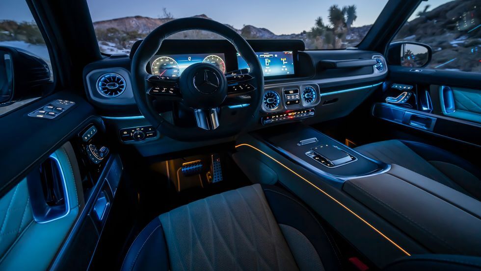 G-클래스의 준군사적 외관과는 대조적으로, 그 내부는 럭셔리한 사양으로 가득 찬 고급스러운 공간을 자랑합니다. 이 차량은 12.3인치 디지털 계기판, 전후방 열선 시트 및 가죽 커버링, 전동 조절 가능한 스티어링 칼럼, 삼영역 자동 기후 조절 시스템, 선루프, 그리고 세 개의 12V 전원 소켓을 기본적으로 탑재하고 있습니다. 선택적으로 추가할 수 있는 옵션에는 앞 좌석 통풍 기능, 열선 내장 스티어링 휠, 나파 가죽으로 마감된 앞좌석 마사지 기능이 포함됩니다. G 매뉴팩처 옵션을 통해 제공되는 독특한 실내 장식은 최고급의 호화로움을 선사하지만, 그에 상응하는 비용이 발생합니다.
