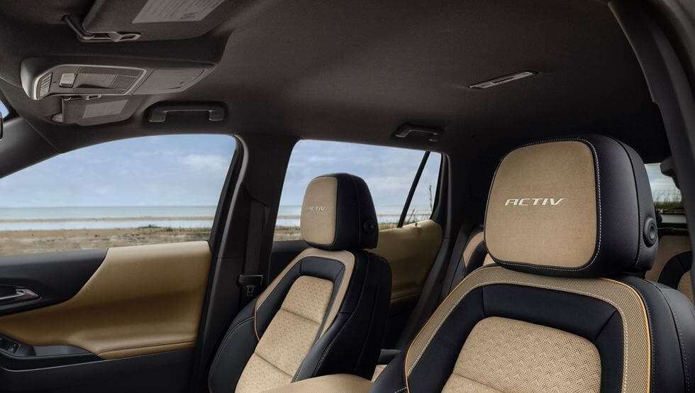 2025년형 쉐보레 이쿼녹스의 실내는 성인 탑승자에게 충분한 공간을 제공하며, 대형 짐이나 식료품을 운반할 수 있는 넉넉한 적재 공간을 갖추고 있습니다. 인테리어는 신선하고 현대적인 스타일로 설계되었으며, 매력적인 소재 사용과 물리적 및 디지털 컨트롤의 조화로운 균형이 돋보입니다. 기본적으로 제공되는 천 커버 외에도 인조 가죽 옵션이 선택 가능하며, 최상위 사양인 Activ 트림에서는 비닐과 극세사의 혼합 사용으로 더욱 고급스러운 외관과 촉감을 선사합니다. 변속 레버가 칼럼에 장착되어 있어 센터 콘솔에 더 많은 수납공간을 확보할 수 있으며, 인포테인먼트 시스템을 조작할 수 있는 로터리 노브 컨트롤러, 선택 사항인 스마트폰 무선 충전기, 컵홀더 등이 편의성을 더합니다.