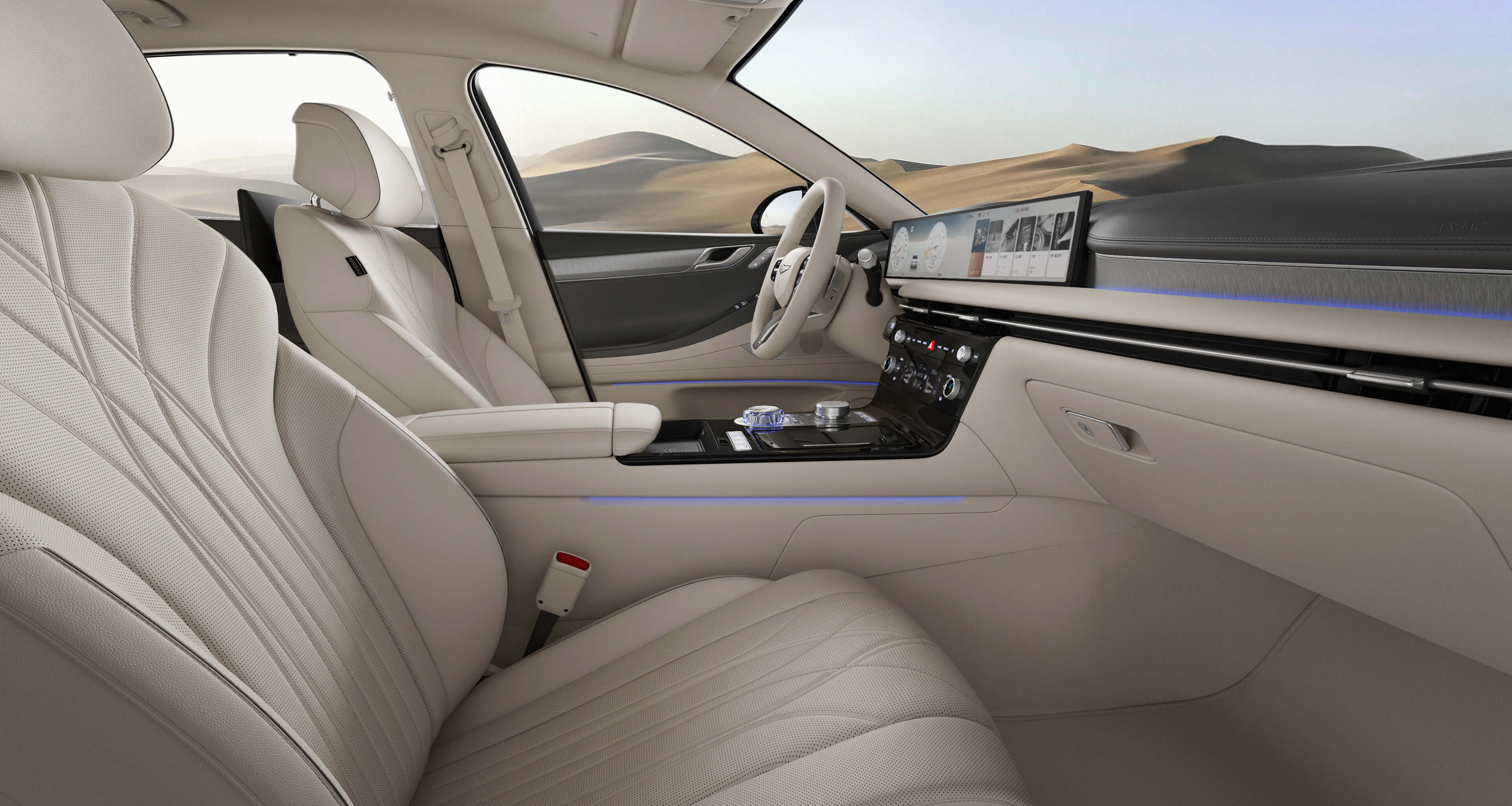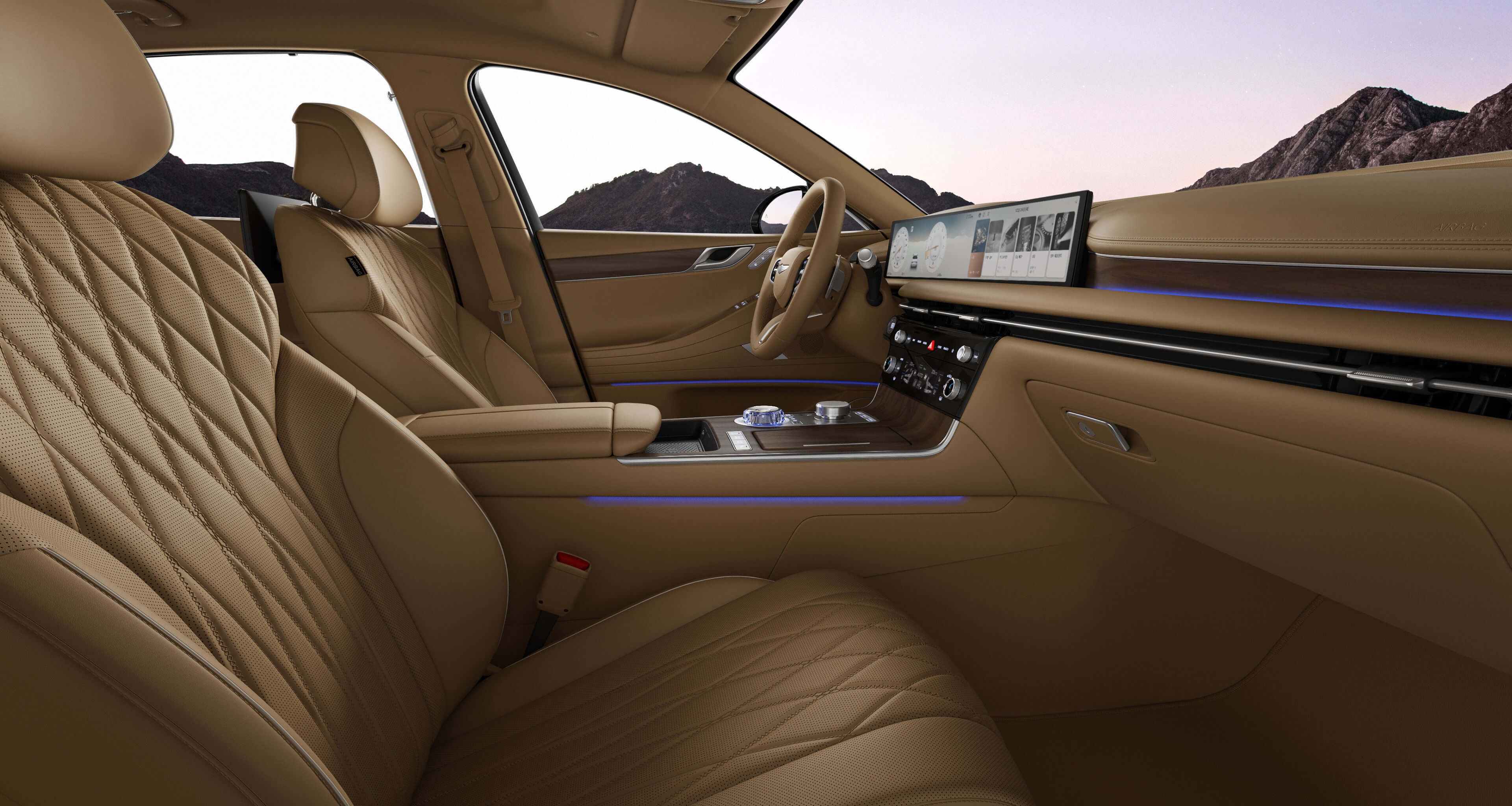 G80는 고급 자동차 시장에 걸맞은 세련된 인테리어를 선보입니다. 내부는 유려한 유선형 대시보드와 부드러운 촉감의 표면, 그리고 고급스러운 소재들이 조화롭게 어우러진 우아한 디자인을 특징으로 합니다. 스티어링 휠의 디자인이 다소 이질적으로 느껴질 수 있으며, 회전식 변속 노브의 배치가 다른 원형 컨트롤 근처에 위치할 경우 직관성이 다소 떨어질 수 있다는 점은 주목할 만하지만, 전반적으로 G80의 인테리어는 뛰어난 품질을 자랑합니다. 이 세단은 대형 OLED 디스플레이를 통해 게이지와 인포테인먼트 정보를 선명하게 제공하며, 앰비언트 인테리어 조명과 헤드업 디스플레이 등 고급스러움을 더하는 다양한 기능들이 탑재되어 있습니다. 또한, 앞 좌석및 뒷좌석에는 열선 및 통풍 기능이 제공되어, 운전자와 탑승자 모두에게 최상의 편안함을 제공합니다. 앞 좌석은헤드룸과 레그룸이 넉넉하여 편안한 주행 환경을 조성하며, 뒷좌석은 비록 넓지는 않지만 성인 두 명이 편안하게 여행할 수 있는 충분한 공간을 제공합니다.