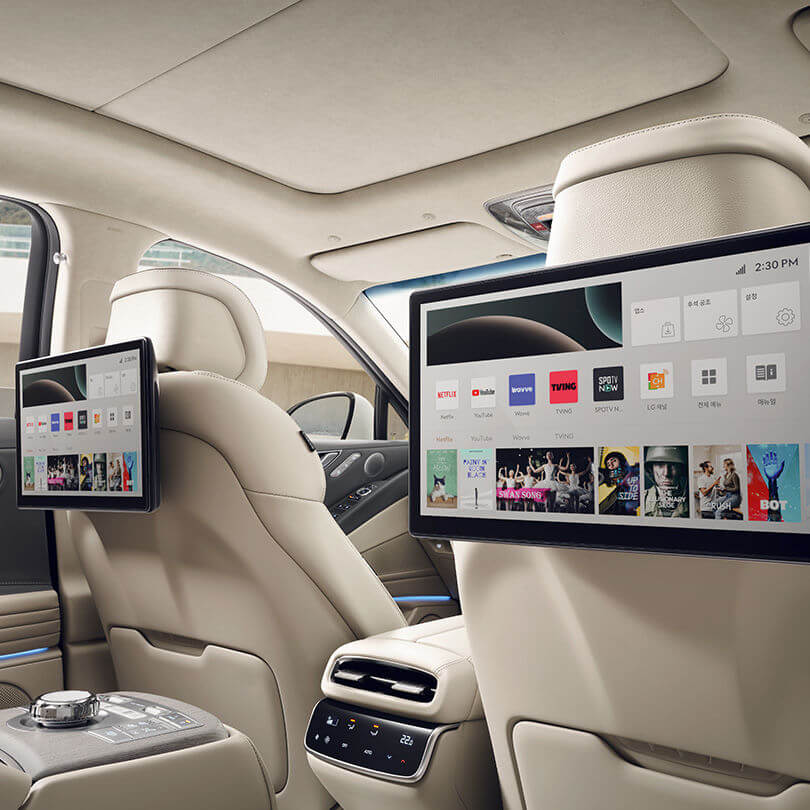 G80의 대시보드 상단에 위치한 커다란 27.0인치 OLED 디스플레이는 차량의 모든 디지털 시스템을 중앙에서 통제하는 중심 역할을 담당합니다. 이 패널의 왼쪽 부분에는 운전자가 필요에 따라 재구성이 가능한 게이지 디스플레이가 있으며, 오른쪽 부분에는 인포테인먼트 인터페이스를 위한 터치스크린이 자리 잡고 있습니다. 이 디스플레이는 센터 콘솔에 위치한 원형 컨트롤러, 스티어링 휠에 장착된 버튼, 그리고 음성 명령을 통해 조작할 수 있어 사용자의 편의성을 극대화합니다. 모든 G80 모델에는 애플 카플레이와 안드로이드 오토가 기본적으로 탑재되어 있으며, 이들은 무선 연결을 통해 작동합니다. 또한, 다양한 사운드 모드를 제공하는 강력한 렉시콘 오디오 시스템은 인포테인먼트 시스템의 일부로, 뛰어난 오디오 경험을 제공합니다.