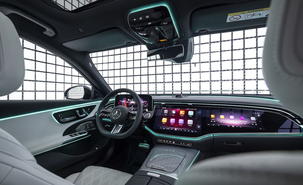 E-클래스의 실내는 다양한 첨단 기술로 가득 차 있으며, 원하는 구매자는 세 개의 디스플레이로 구성된 대시보드를 선택할 수 있습니다. 하지만 저희는 좀 과한 옵션이라고 판단하여 기본 사양을 선택했습니다. 이 기본 사양에는 스티어링 휠 뒤에 차량의 게이지를 위한 디지털 디스플레이와, 대시보드 중앙에 인포테인먼트를 위한 별도의 스크린이 포함되어 있습니다. 메르세데스-벤츠는 셀카 카메라, 다운로드 가능한 타사 앱(예: TikTok, Angry Birds, Zoom 등)과 같은 독특하고 재미있는 기능들을 통합했습니다. 이러한 기능들은 사용자에 따라 편리하거나 다소 불편할 수 있습니다. 또한, 대시보드 내비게이션은 사용 가능하며, 헤드업 디스플레이를 통해 전방 도로에 길 안내를 오버레이하는 증강 현실 기능을 제공하여 운전자의 안전과 편의를 도모합니다.