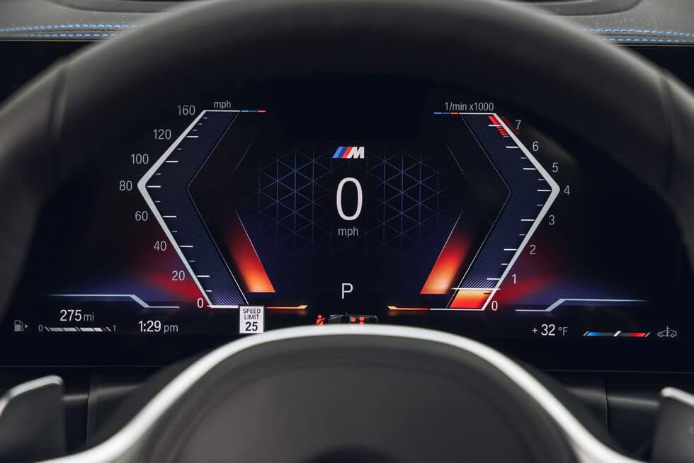 BMW 3시리즈의 대시보드는 12.3인치 게이지 디스플레이와 14.9인치 인포테인먼트 디스플레이가 단일 패널로 결합되어 부드럽게 배치되어 있습니다. 이 고해상도 디스플레이들은 시각적으로 매력적이며, 직사광선 아래에서도 뛰어난 가독성을 자랑합니다. BMW의 iDrive 8 인터페이스는 사용자 친화적이며 반응이 빠르고, 탐색이 용이합니다. 차량에는 대시보드 내비게이션, 무선 애플 카플레이 및 안드로이드 오토, 시리우스XM 위성 라디오, 5G Wi-Fi 핫스팟과 같은 다양한 최신 기능이 기본적으로 제공됩니다. 프리미엄 패키지를 선택할 경우, 차량에는 헤드업 디스플레이가 추가되어 운전자의 편의성을 더욱 향상시킵니다. 또한, 스마트폰을 위한 무선 충전 패드와 하만/카돈 스테레오 시스템을 선택 사항으로 제공하여 사용자의 경험을 더욱 풍부하게 만들어 줍니다.